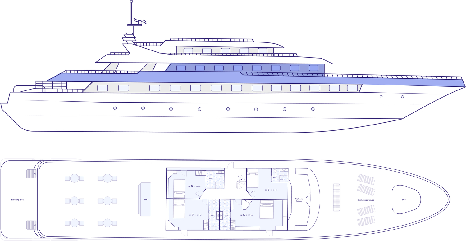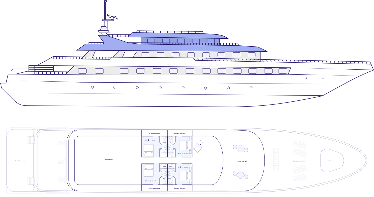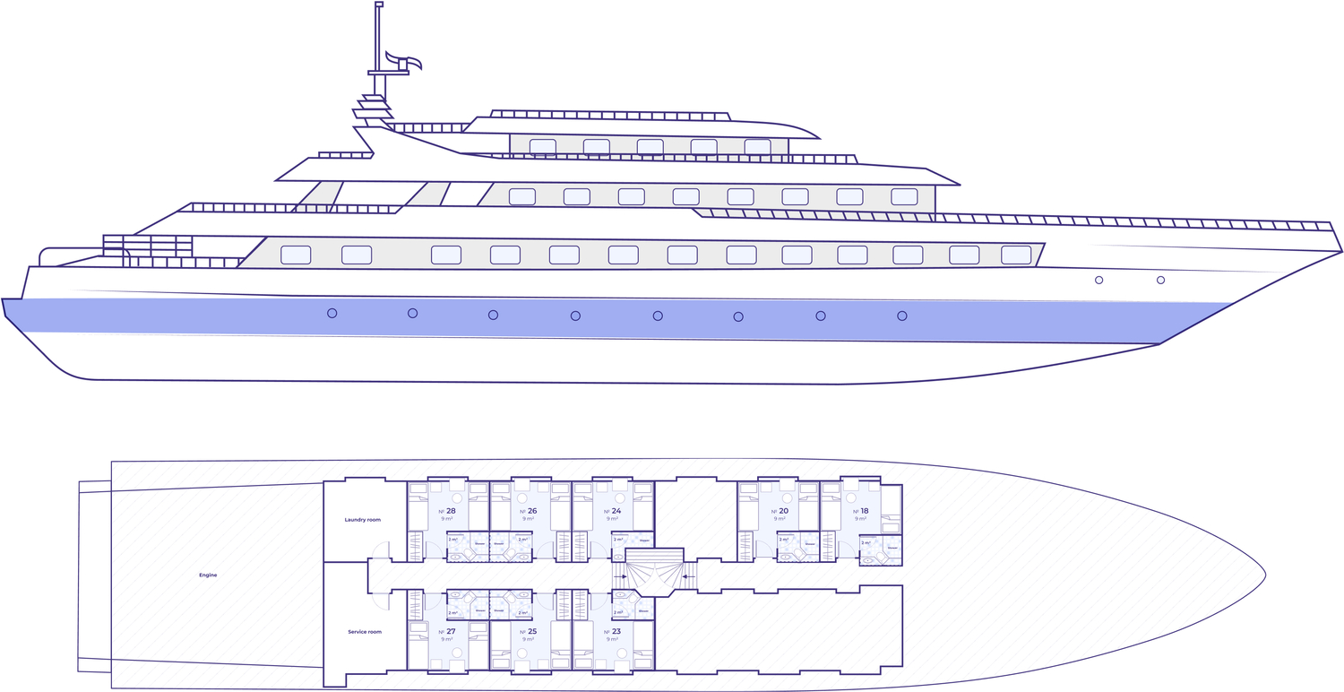 - Deluxe Twin 2 beds (connected) – каюты площадью 8 и 9 м2 с двумя раздельными кроватями, идеально подходят для размещения друзей или детей. Эти каюты могут соединяться с Deluxe Queen bed каютами.
