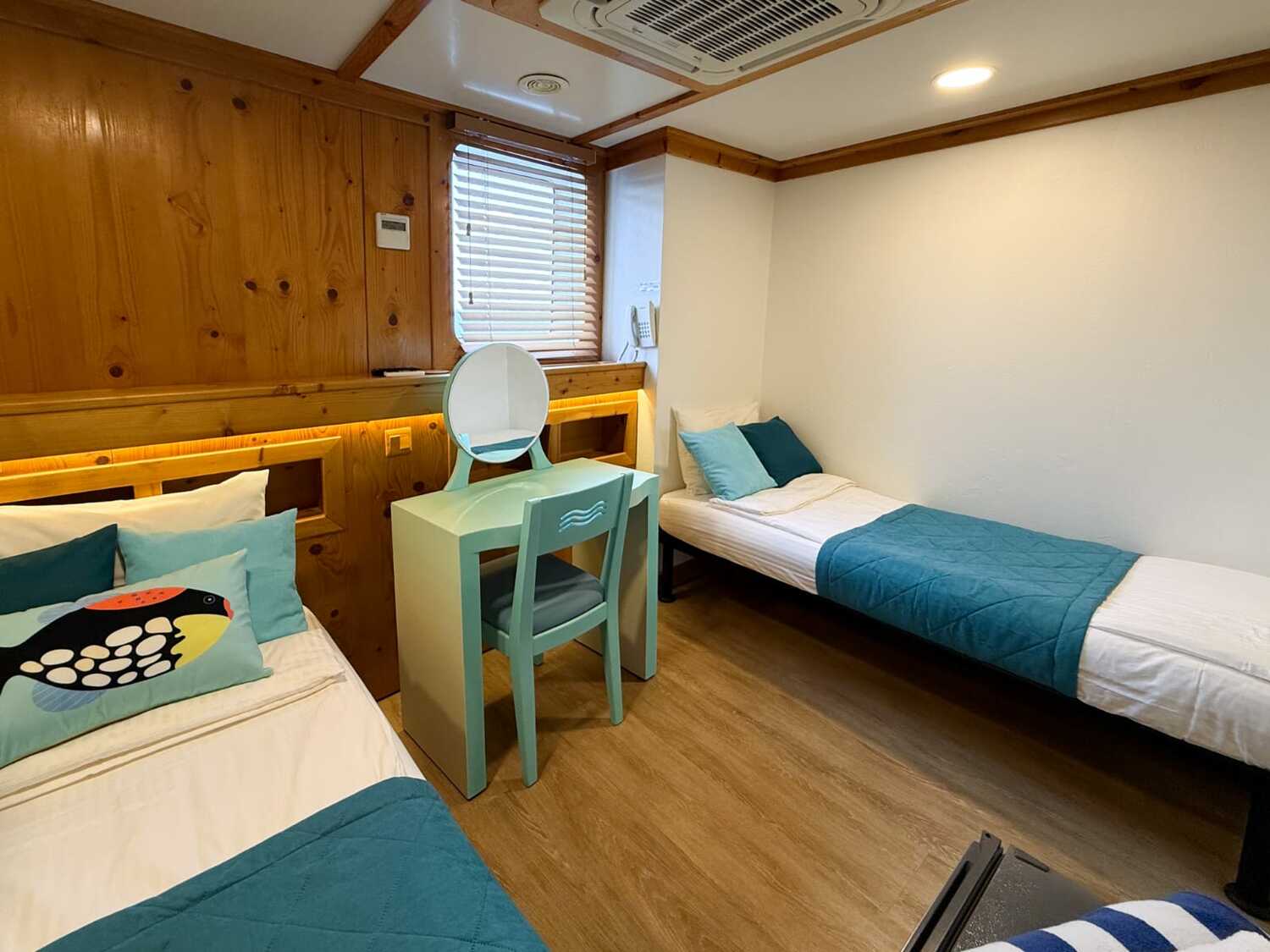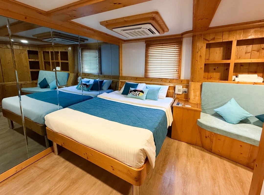 - Deluxe Queen bed (connected) - двухместные каюты, имеют 2-спальную кровать queen size площадью 9 м2 и могут соединяться с номерами Deluxe twin, что идеально подходит для отдыха с детьми.